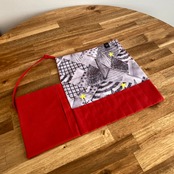 赤い無地の布を合わせることで、夜の森に差す暖かな灯りのようなコントラストが生まれ、見るたびに物語を感じさせる、印象深い仕上がりになっています。