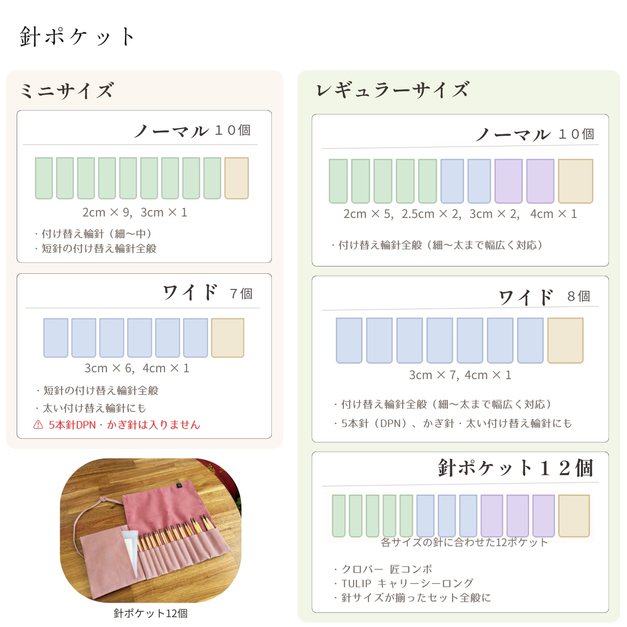 ・ワイド / 針ポケット7個→ 太い付け替え輪針用(縦が13cm程度なので、5本針DPN・かぎ針は入りません )