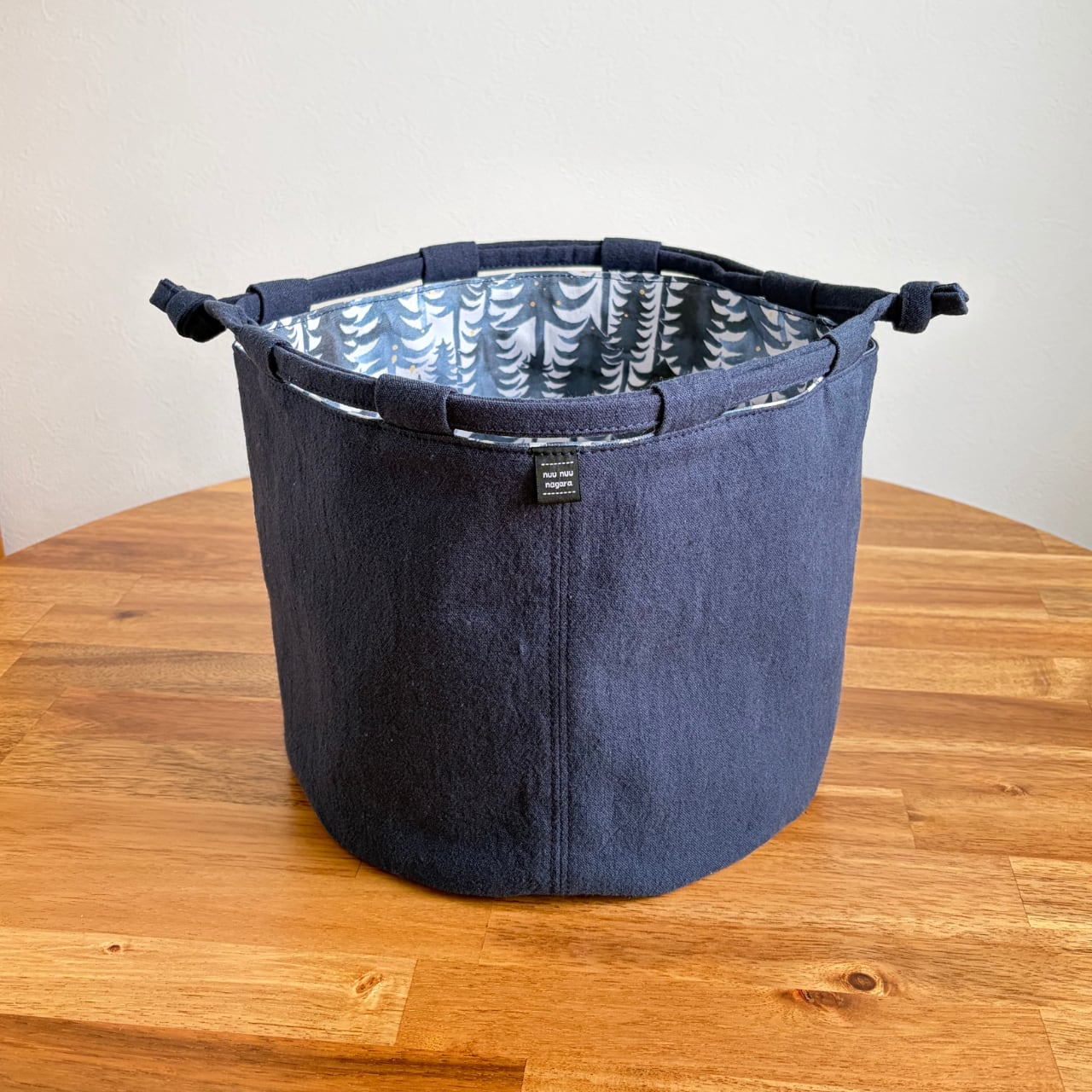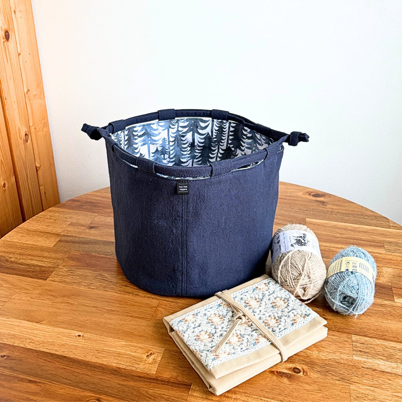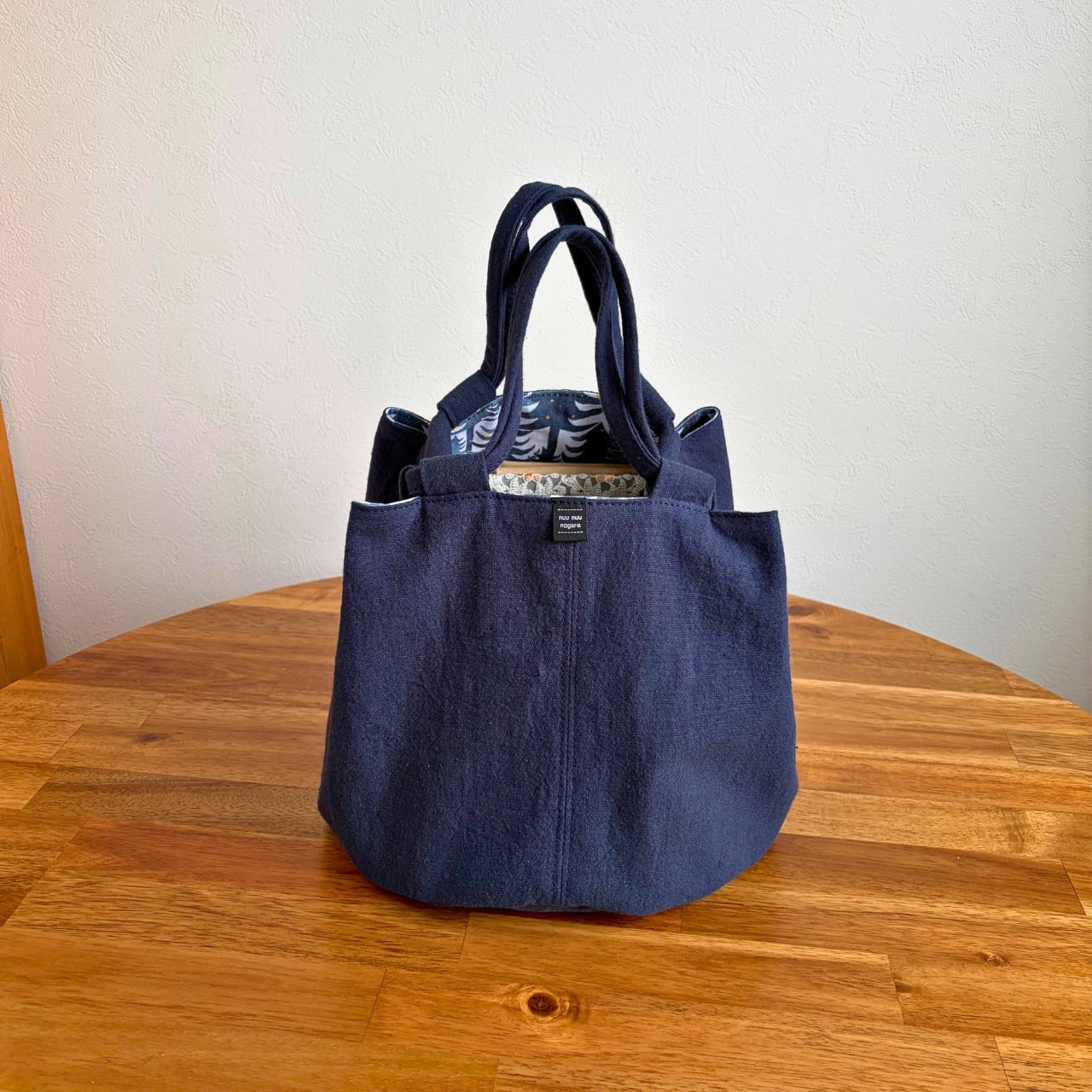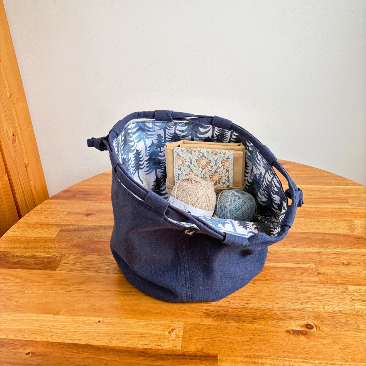 プロジェクトバッグ / ネイビーforest / 自立する丸底バッグ / 編み物 手芸 小物収納に