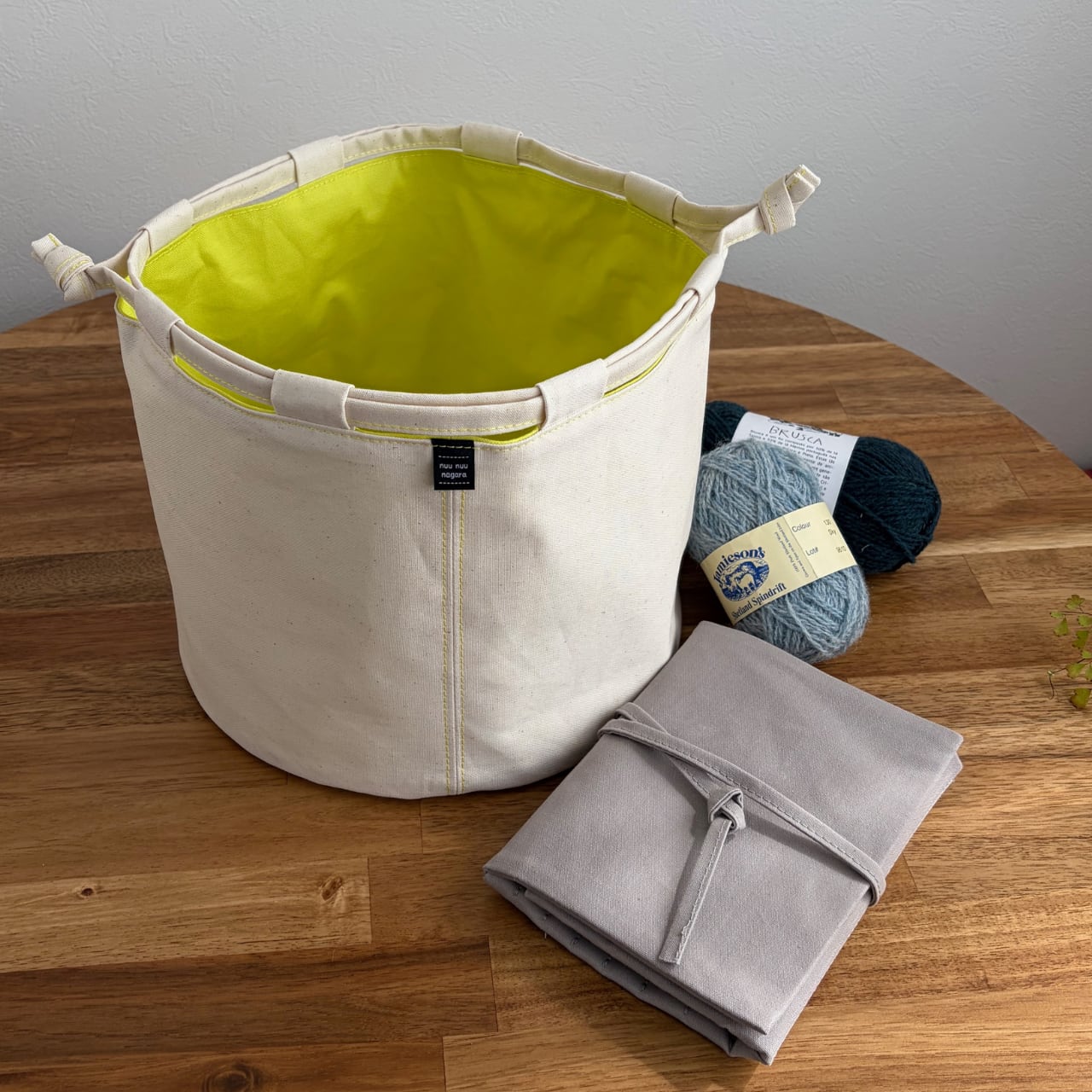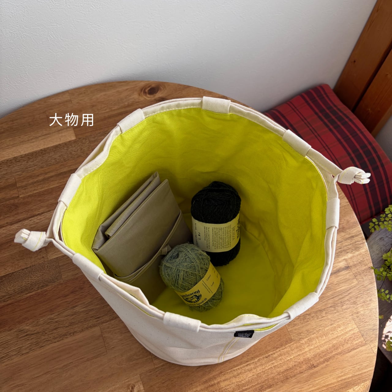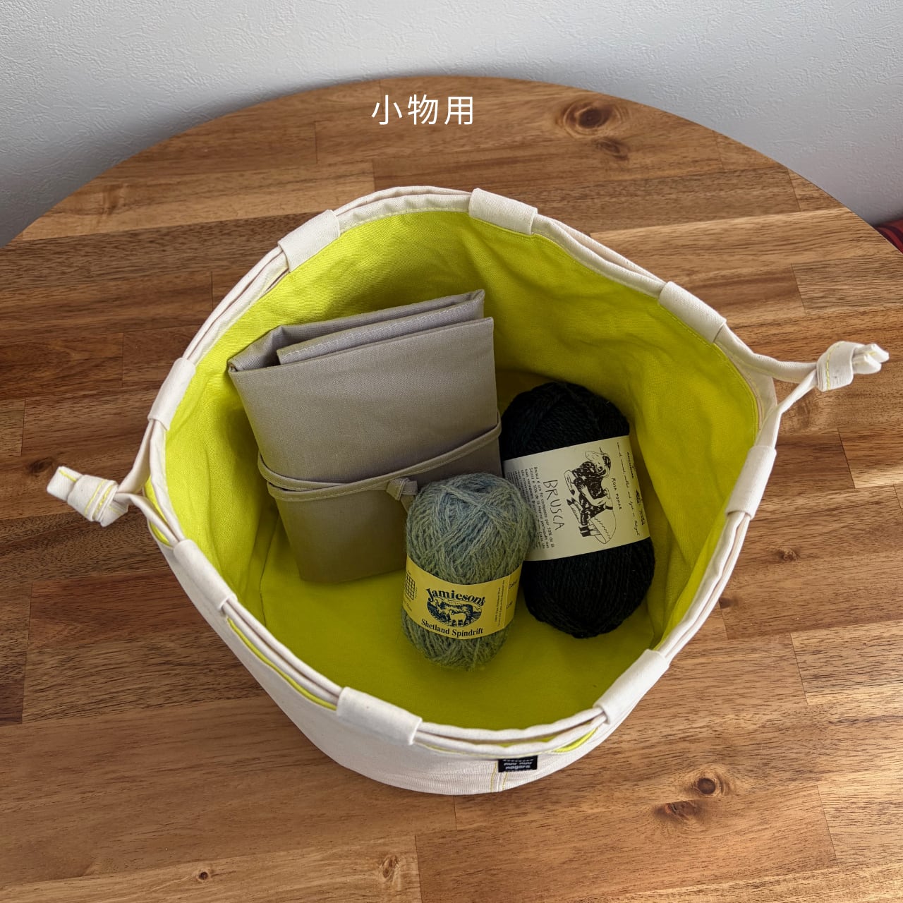 丸底で自立する巾着プロジェクトバッグ|編み物・手芸小物の収納に|大物用・小物用|生成り×蛍光イエロー