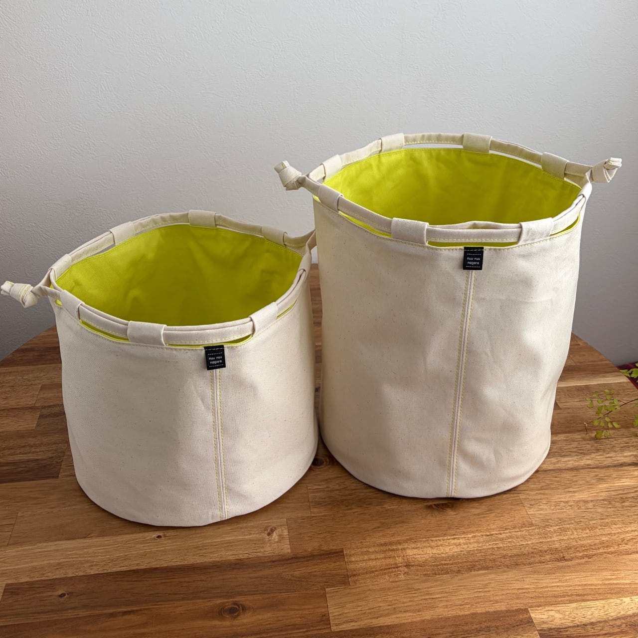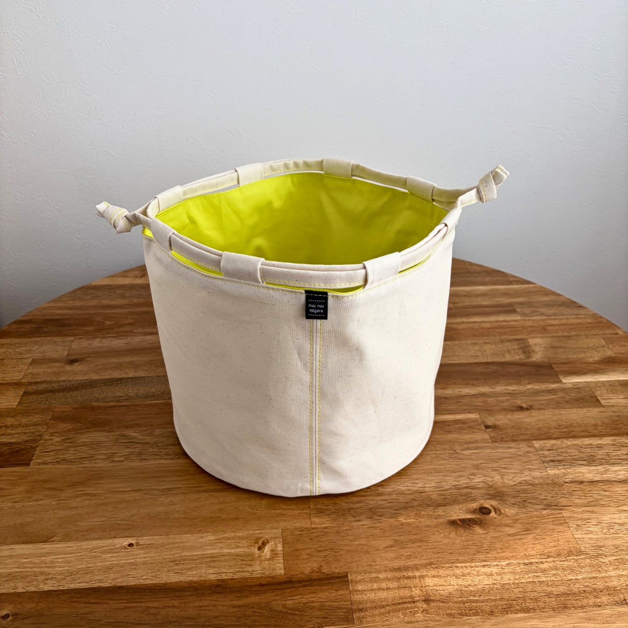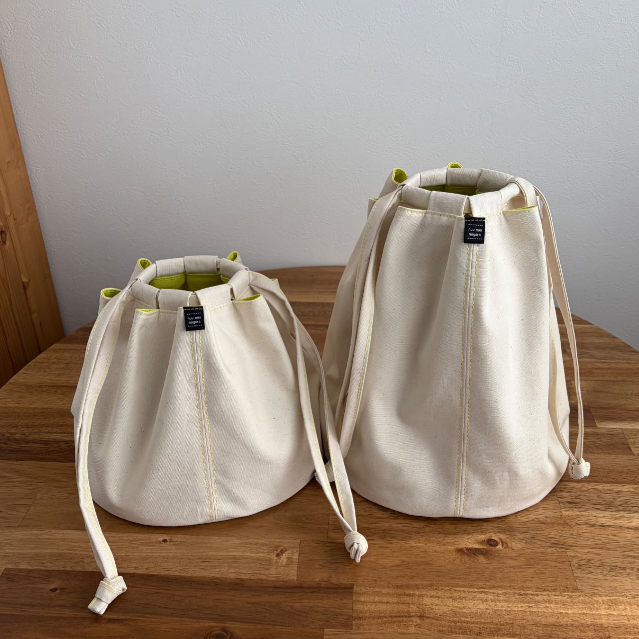 丸底で自立する巾着プロジェクトバッグ|編み物・手芸小物の収納に|大物用・小物用|生成り×蛍光イエロー